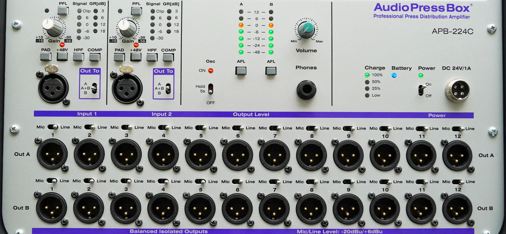 APB-224 C 2 Hat/Mikrofon girişi ve 24 Hat/Mikrofon çıkışına sahip profesyonel taşınabilir 2 kanallı aktif pressbox. Dahili şarj edilebilir akü paketi ve ağır hizmet tipi Nanuk kasası sayesinde hem iç hem de dış mekan basın konferansları için uygundur. 2 MIC (phantom power) / LINE Girişi – kazanç kontrolü ve 26dB PAD ile dengelenmiştir Her Giriş A/(A+B)/B Çıkış Grubuna yönlendirilebilir 24 dengeli ve ayrı ayrı transformatörle izole edilmiş çıkış Her Çıkış MIC veya LINE çıkış seviyesi arasında değiştirilebilir 2 dahili Çıkış Grubu: 12x Çıkış A ve 12x Çıkış B Her Giriş kanalı için değiştirilebilir Yüksek Geçirgen filtre Her Giriş kanalı için değiştirilebilir Kompresör ve Sınırlayıcı Her Giriş/Çıkış kanalı için PFL/AFL Sabit seviye Hatasız anahtarlama işlemiyle test sinyali osilatörü PFL/AFL için kulaklık kontrol çıkışı Mikroişlemci kontrollü pil yönetimine sahip Li-Ion AccuPack 10 saat pil çalışma süresi. Not: AccuPack ünitenin içine yerleştirilmiştir (dahili) AudioPressBox, sesi yayın kalitesinde sunar